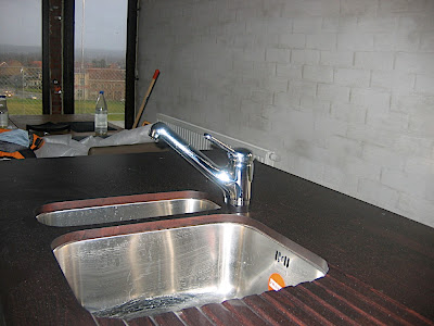 Deze week hebben de schrijnwerkers de kasten in de leefruimte, de keuken en badkamer opgebouwd. 't is nog niet 100% afgewerkt maar onderstaande foto's moeten toch al een impressie geven: